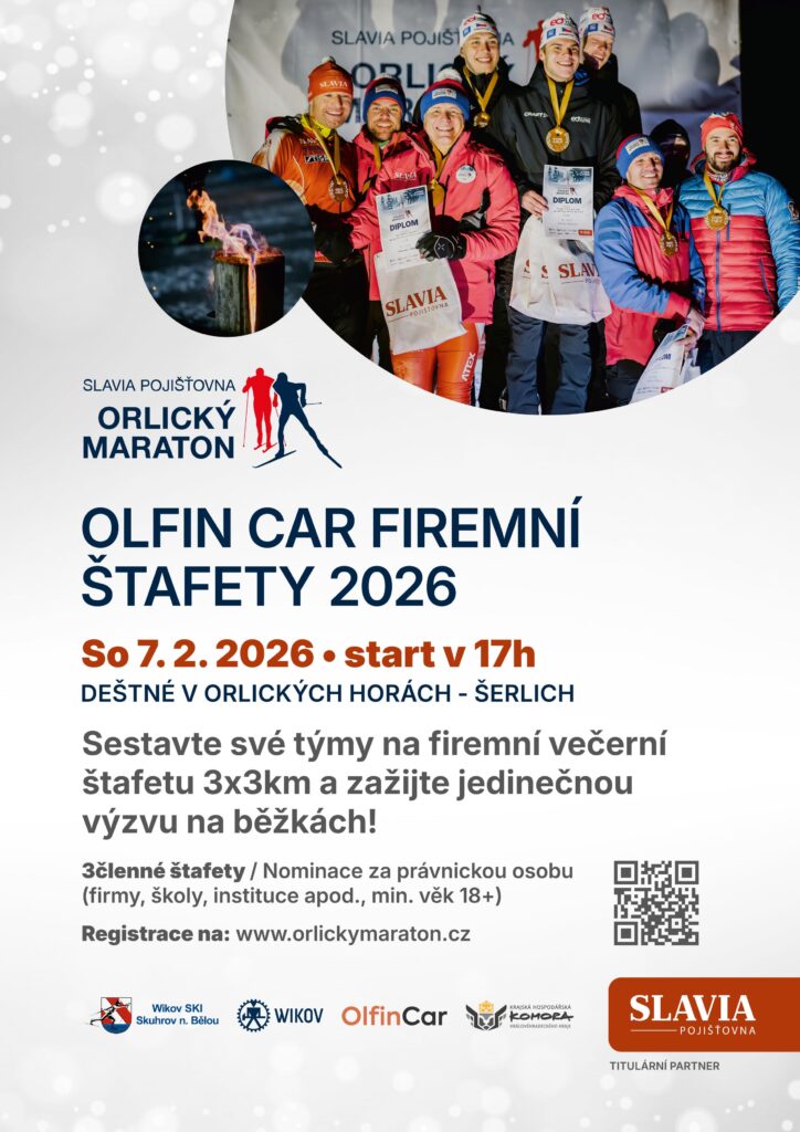 Krajská hospodářská komora Královéhradeckého kraje je již třetím rokem partnerem závodu OLFIN CAR Firemní štafety, které se uskuteční v rámci 42. SLAVIA POJIŠŤOVNA Orlického maratonu. Dějištěm závodu bude tradičně Deštné v Orlických horách. Zveme všechny nadšené sportovce, běžkaře a milovníky sněhu, aby ve firmách a organizacích sestavili tříčlenné týmy a poměřili své síly na potemnělé trati 3×3 km za svitu čelovek.